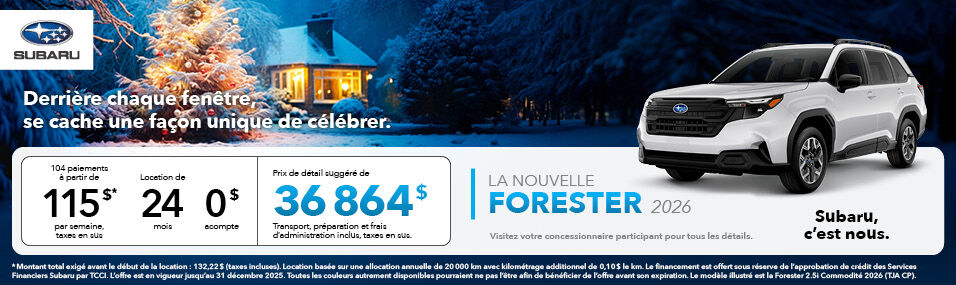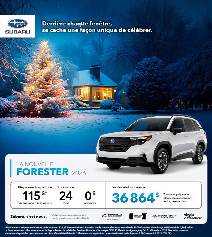 Le respect de votre vie privée est fondamental pour nous. Pour savoir comment Subaru Canada, Inc. protège les renseignements personnels que vous lui communiquez, veuillez consulter notre Politique de protection des renseignements personnels.
